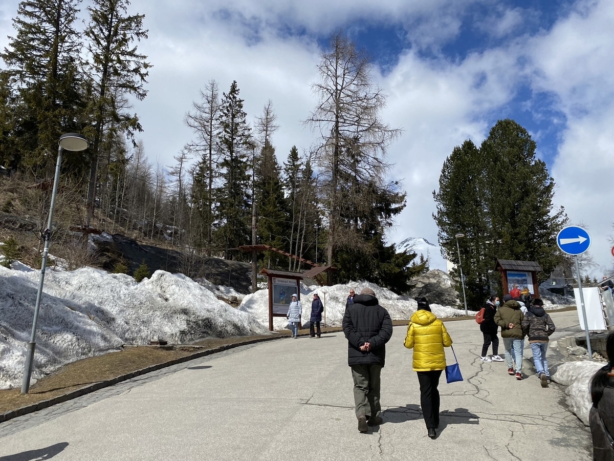 この日はイースターの真っ最中にもかかわらずもの凄く多くの観光客で賑わっていました。ものすごい大きな駐車場も8割方埋まっていました。ここは、まだ雪が多く残っていて、スキー板を担いでここからバスで更に山を登りスキーに行く人、ハイキングを楽しんでいる人がたくさんいました。標高がそこそこ高いという事もあり、4月中旬にもかかわらず体感温度は真冬並みでした笑